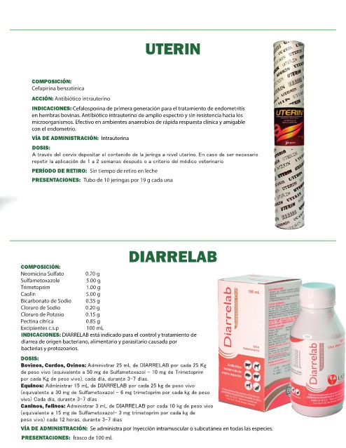 Bovinos, Cerdos, Ovinos: Administrar 25 mL de DIARRELAB por cada 25 Kg