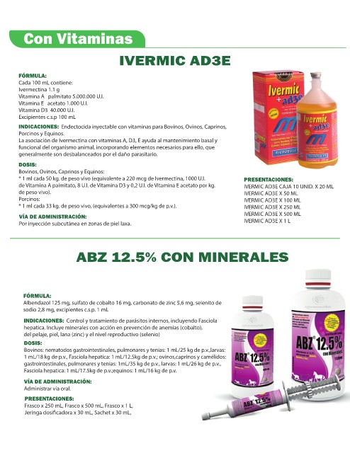 * 1 ml cada 50 kg. de peso vivo (equivalente a 220 mcg de Ivermectina, 1000 U.I. PRESENTACIONES: