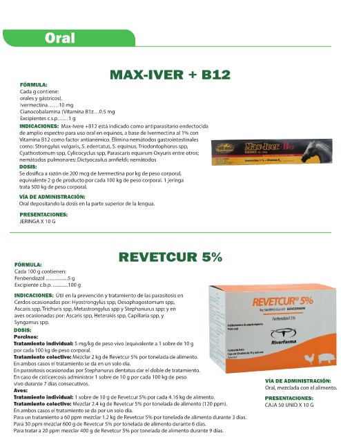 Tratamiento colectivo: Mezclar 2.4 kg de Revetcur 5% por tonelada de alimento (120 ppm). CAJA 50 UNID X 10 G
