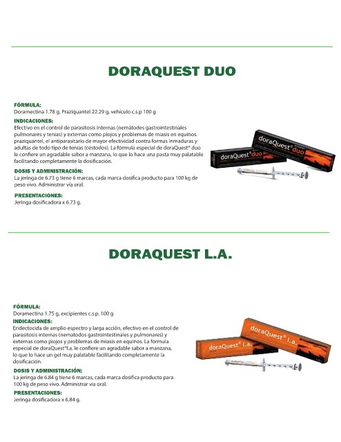 Doramectina 1.78 g, Praziquantel 22.29 g, vehículo c.s.p 100 g