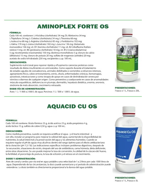 Aves: 1 L / 1 000 a 2 000 L de agua. Porcinos: 1 L / 500 a 1 000 L de agua. Frasco x 1 L, Frasco x 20L.